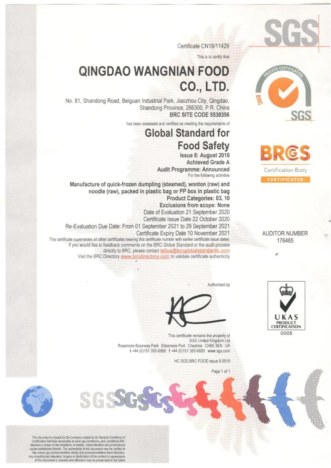 青島旺年食品有限公司榮獲BRC食品技術標準A級認證!